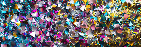 Gold, silver and blue confetti on a black background. Macro
