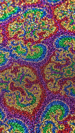 A vibrant, multicolored paisley pattern made of tiny sparkling glitter dots in a array of rainbow colors.