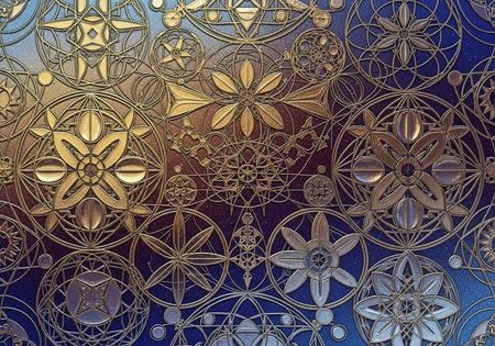Detailed mandala designs in gold and silver on a deep blue backdrop, featuring circular and floral motifs.