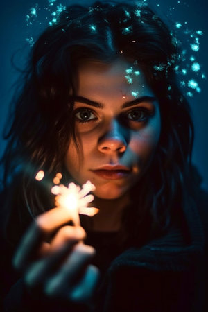 A captivating portrait of a woman with glowing particles surrounding her face, creating a dreamy, magical atmosphere.