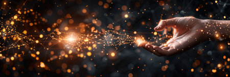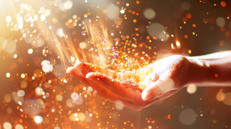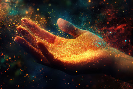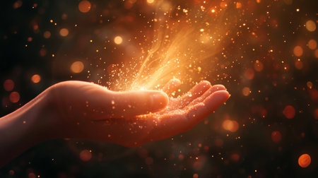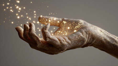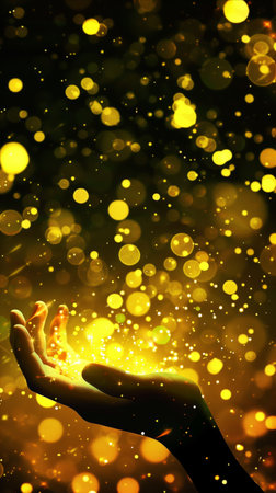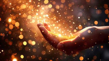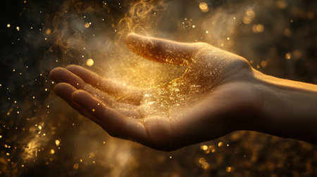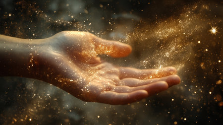 A mesmerizing image of a hand surrounded by sparkling magical light and golden dust, symbolizing enchantment and mysticism