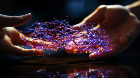 A human hand, interwoven with glowing blue neural networks, summons a swirling cloud of digital energy.