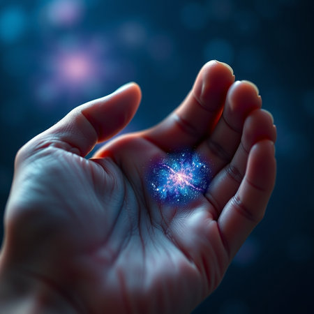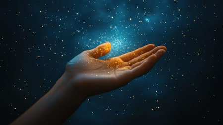 A hand outstretched, palm open, displays countless tiny stars sparkling as if holding a fragment of the universe. This ethereal scene evokes feelings of wonder and magic.