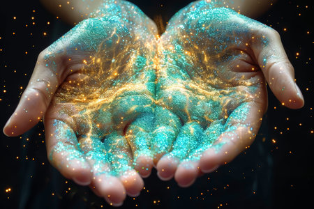 Close-up of hands holding glittering particles with bright bokeh effect.