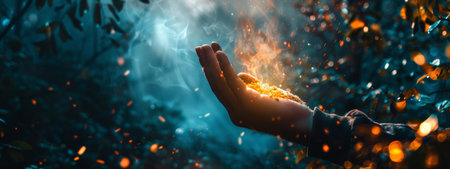 Hand features golden glowing lights swirled in a mystical manner within an enchanted forest. the image exudes a magical atmosphere, making it ideal for fantasy-themed artworks, posters, cards, and other digital designs with a touch of enchantment.