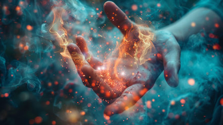 Hands holding mystical flames with fiery sparks, representing magic, power, and fantasy, in an ethereal and captivating scene.