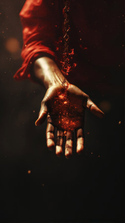 A human hand holds a vibrant cloud of red energy, rendered in a digital illustration style. The composition emphasizes the interplay of light and shadow, with a dark backdrop enhancing the glowing energy. This image can be used for conceptual designs, artistic projects, and various creative endeavors.