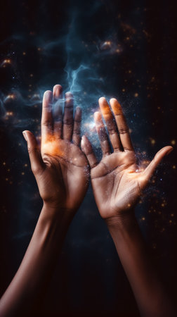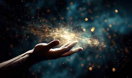 A mesmerizing and captivating image of a hand joyfully extended outward, surrounded by enchanting light and glittering cosmic dust, beautifully evoking a profound sense of wonder and pure magic