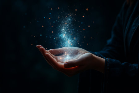 A hand holds glowing particles in a mystical, dark environment, symbolizing magic, wonder, and the power of imagination.