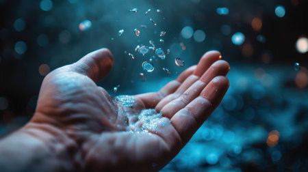 A stunning close-up captures a hand gently releasing shimmering water droplets against a dark, moody backdrop, creating a serene and magical atmosphere.