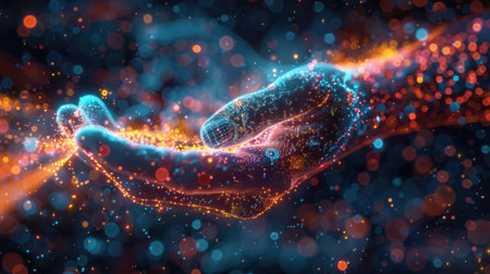 Hand interacting with glowing, ethereal particles and digital streams, symbolizing the connection between technology and human touch in futuristic environment.