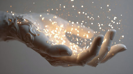 An outstretched hand captures a burst of light, symbolizing concepts of magic, power, and creativity. A.I.