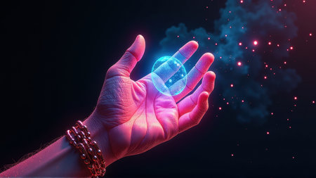 Hand Holding Glowing Orb, Futuristic Magic, Neon Light, Mystical Energy, generative Ai