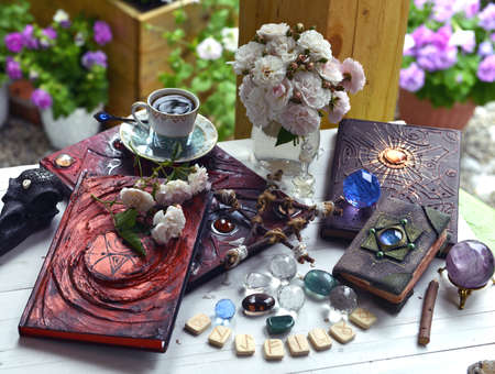 Vintage summer still life with old spell book, runes, crystals and magic object on witch table. Esoteric, occult and mystic concept for witchcraft