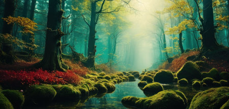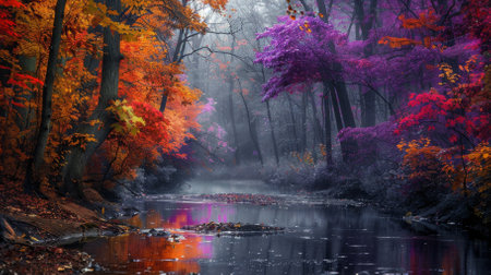 Beautiful fantasy landscape with a river flowing through the forest in autumn