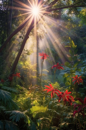Golden sunbeams pierce through the dense green canopy of a forest, illuminating a branch adorned with vibrant red flowers and the forest floor.