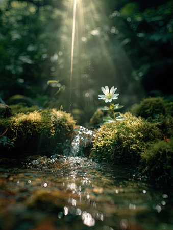 A white flower, illuminated by sunlight, stands beside a stream. The scene features lush green moss and flowing water reflecting light. Soft focus and depth of field create an ethereal effect. Suitable for editorial and commercial use, the image is well-suited for nature and wellness themes.