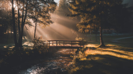 Serene landscape featuring wooden bridge over gentle stream, surrounded by tall trees and soft sunlight filtering through foliage. scene evokes sense of tranquility and natural beauty