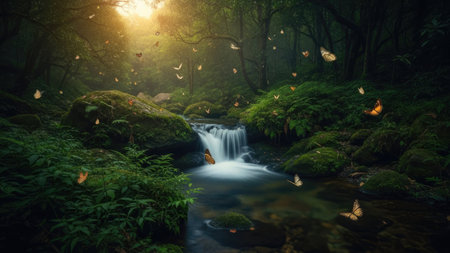 Beautiful waterfall in the forest with sun rays and flying butterflies.