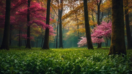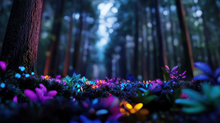 A forest with colorful flowers and a tree. The flowers are bright and colorful, and the tree is tall and dark. Scene is peaceful and serene, as the forest is a natural and calming environment