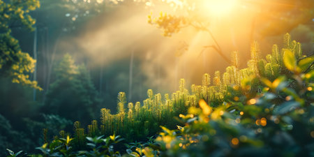 Golden sunlight filtering through lush green foliage, creating a peaceful and serene natural environment, perfect for outdoor and nature themes.