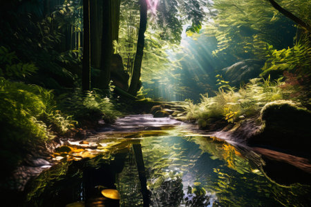 A tranquil scene captures a stream flowing through a vibrant green forest. Sunlight filters through the trees, illuminating the water and foliage. The image displays a natural composition with soft textures and varying shades of green. Suitable for diverse applications, including nature, environment, and wellness content.