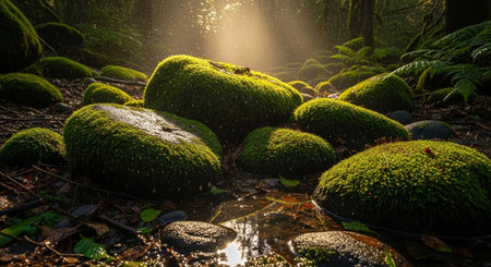 An inviting forest path winds through dense foliage, illuminated by sunlight filtering through the canopy. The scene showcases moss-covered rocks, vibrant green plants, and fallen leaves. The artistic style and composition create a serene and natural atmosphere, suitable for various editorial and commercial applications.