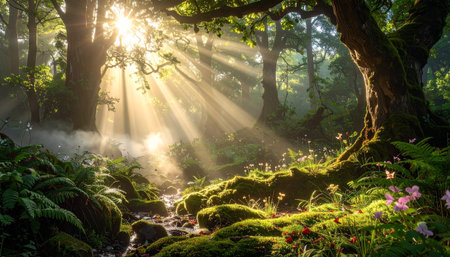 Golden sunbeams filter through a misty forest canopy onto a moss-covered forest floor with wildflowers.