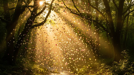 Enchanting Sunlight Filtering Through Dense Forest Canopy, Creating Magical Bokeh and Light Effects