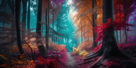 Fantasy infrared image of a magical forest illuminated by neon lights.