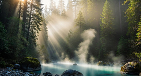 Mystical waterscape showcases serene river flowing through dense forest under soft light in enchanting natural setting