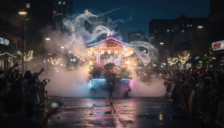 Illuminated float emitting swirling fog as it glides past excited onlookers creating a mystical and captivating scene at night.