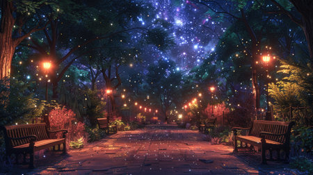the park at night, as the moon casts a soft glow on the wooden benches and leafy park alley, creating a magical atmosphere