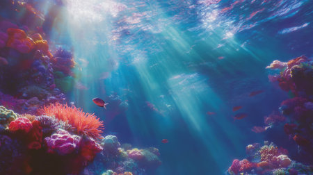 Dive into a captivating underwater scene filled with vibrant corals and schools of fish, illuminated by radiant beams of sunlight, showcasing nature's beauty.