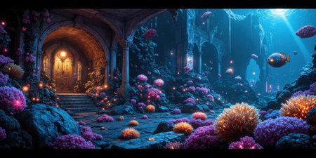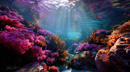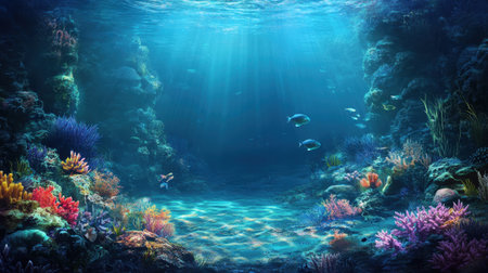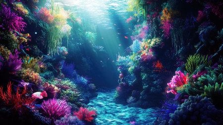 Enchanting Underwater Ethereal Landscape with Vibrant Coral Reef Ecosystem Colorful glowing marine life and natural textures create a serene dreamlike scene in the depths of the ocean