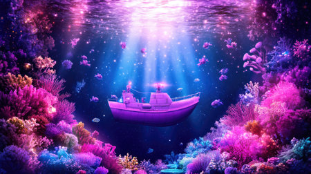 Fantasy submarine voyage through vibrant underwater coral wonderland.