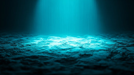 An underwater scene features a textured surface with shafts of light piercing through. The image presents a dark, aquatic environment with an indistinct form in the distance. Its dark color palette and composition may suggest various uses, from editorial illustrations to commercial design projects. It evokes depth and mystery.