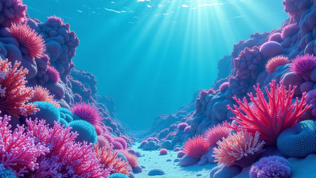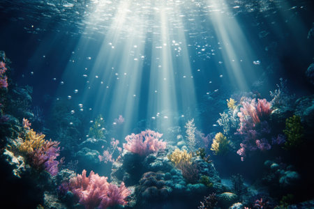 A serene underwater landscape showcasing vibrant coral formations, with sunbeams piercing through the clear ocean depths.