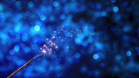 A mesmerizing image of a magic wand emitting sparkling light against a soft blue bokeh background, perfect for festive designs and enchanting themes.