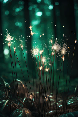 A captivating sparkler emits a bright glow in the night, creating a magical atmosphere. Bokeh lights add depth and charm, perfect for celebrations.