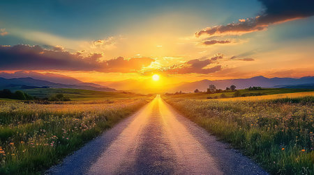 AI generative. Road leading into a sunset. Road through the scenic landscape to the destination
