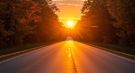 Generative AI : Nature landscape sunset light above asphalt road