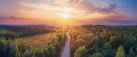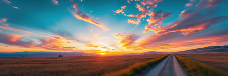 A tranquil scene showcasing a picturesque sunset over a winding road, bordered by lush golden fields under a colorful sky, setting a peaceful mood.