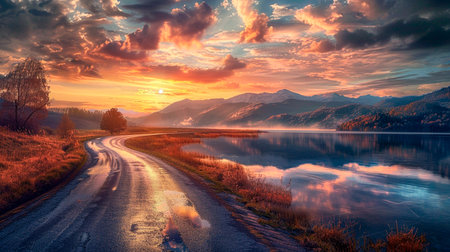 Lake and road at sunset background - Ai Generated
