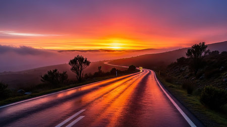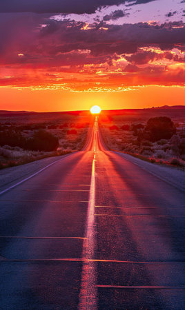 An asphalt road stretches into the distance, framed by a vast landscape under a vibrant sunset. The sky displays intense colors, with shades of orange and purple dominating the horizon. The composition captures the open road with a sense of depth, suitable for travel or scenic themes. The image could be used for advertising or editorial content.