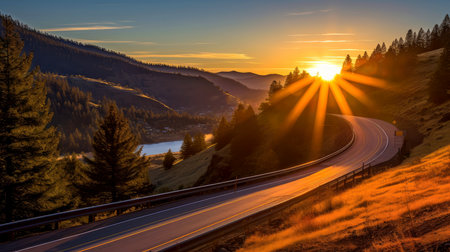 Journey to Dusk: Scenic Road Leading Towards a Sunset by the Mountains