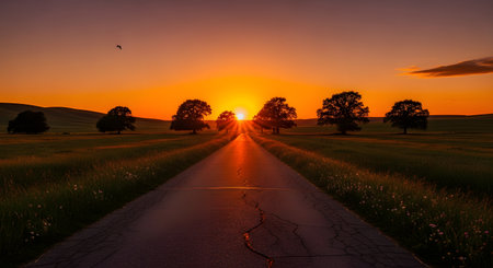 An asphalt road stretches straight towards a vibrant orange sunset, flanked by silhouette trees and lush green fields. The scene evokes a sense of journey, travel, and the peaceful beauty of the countryside at dusk.