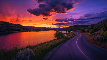 A stunning sunset casts a vibrant palette of colors over a calm lake with lush greenery lining the winding road, creating a serene and picturesque scene.