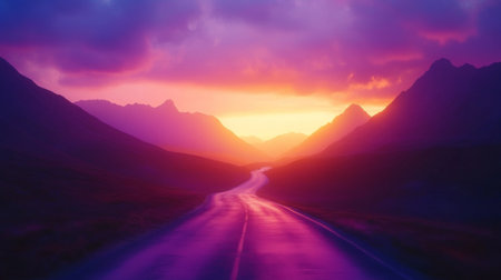 A winding road leads through majestic mountains under a vibrant sunset. The dramatic colors create a serene atmosphere, inviting travelers on an adventure.