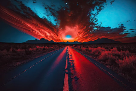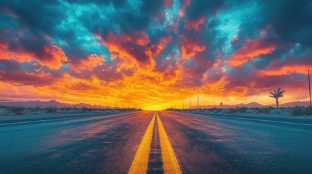 A vibrant sunset sky over a straight road leading through the desert. Generate AI ,